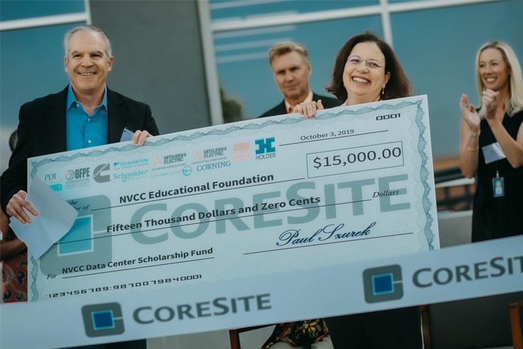 Paul Szurek, President & CEO at CoreSite, presenting a check to Julie Leidig, Provost of Northern Virginia Community College at the Loudoun Campus.